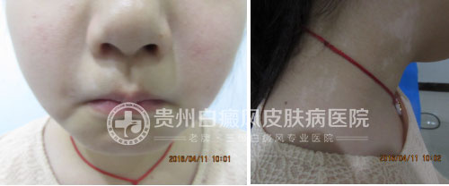 鉴于白癜风疾病易复发的特殊性质,患者每年春天在白癜风易发季节,需继续到医院采取巩固治疗。彤彤及家长也谨遵医师教诲,今年春天也不忘记来医院做抗复发治疗。经过几次的抗复发治疗,患者颈部及脸颊的白斑已经完全祛除。