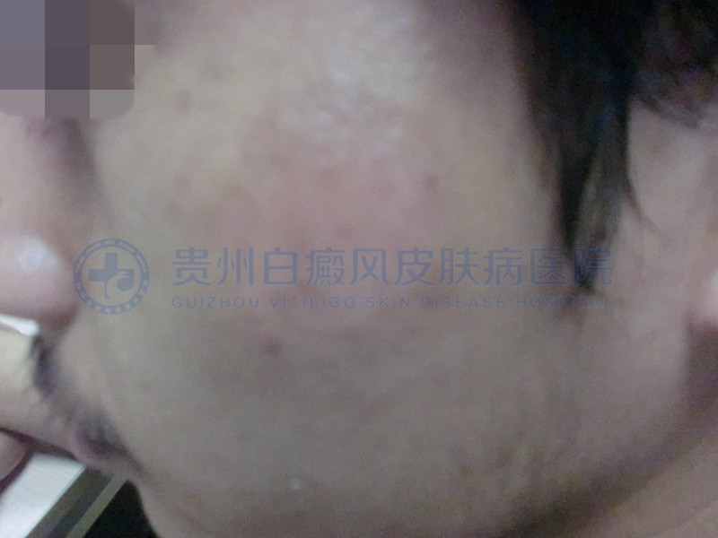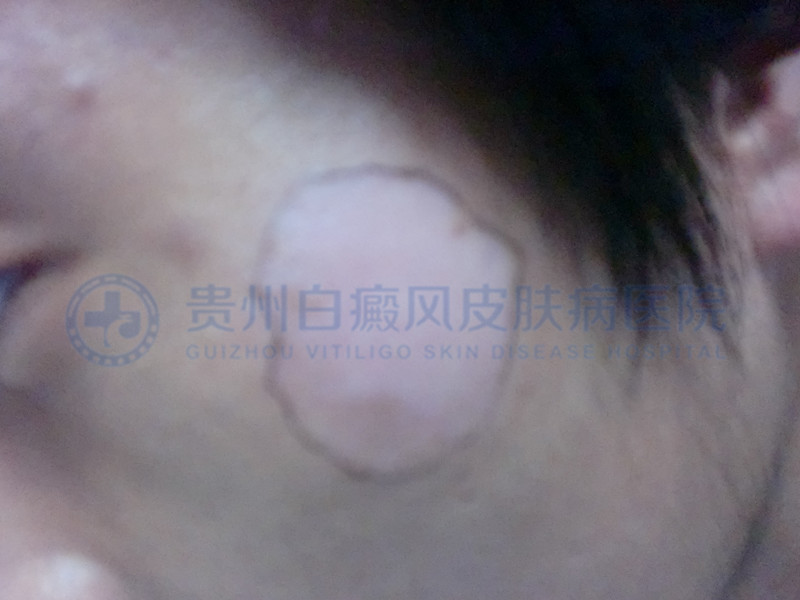 患者来我院初诊,面部白斑清晰可见,色素脱失较严重,处于进展期。