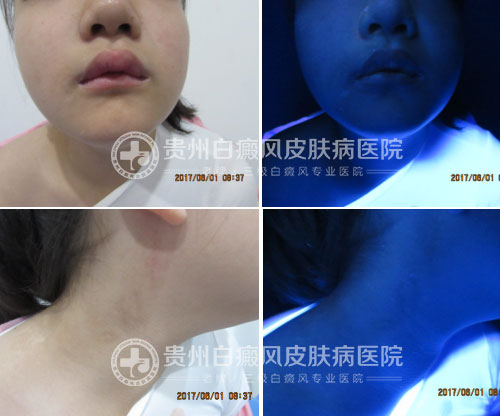 事情还要追溯到去年春天,小小年纪的彤彤不知为何诱因右颈部突然出现指甲大小的白斑,境界模糊不清,不到半年的时间扩大到碗口大小,甚至扩散到鼻翼下、右嘴角。看着活泼的彤彤被白斑折磨的郁郁寡欢,彤彤外公带着她到贵阳市一家综合性儿童医院治疗,医院诊断孩子的白斑实乃白癜风,并给予“他克莫司软膏”外涂及口服药治疗,治疗了几个月白斑仍没有好转。后来彤彤外公打听到贵州白癜风皮肤病医院是一家专门研究白癜风的专科医院,于是带着彤彤前来治疗。